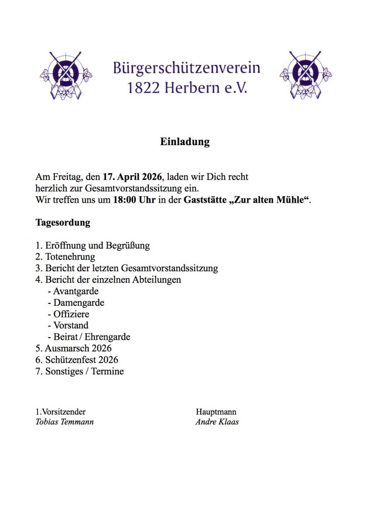 Herzliche Einladung zur Gesamtvorstandssitzung by Marco März 27, 2026 März 27, 2026 27 Herzliche Einladung an all unsere Offiziere, Vorstandsmitglieder und Mitglieder der Ehrengarde zur Gesamtvorstandssitzung am 17. April um 18:00 Uhr in der Gaststätte „Zur alten Mühle“. 0 FacebookTwitterPinterestEmail vorheriger Artikel Generalversammlung 2025
