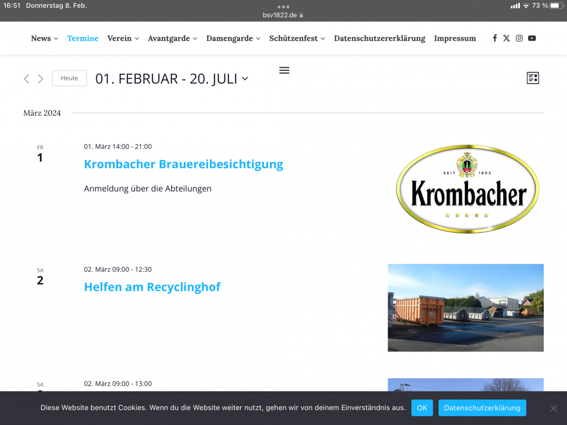 Das Jahr ist frisch gestartet. Und schon halb verplant. Unter dem Punkt Termine könnt ihr die Termine vom Verein, von der Avantgarde sowie der Damengarde anschauen. Man kann den Kalender auch abonnieren, dann findet ihr unsere Termine in eurem Kalender.